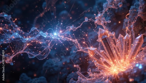 crystal, energy, glowing, light, digital, art, fantasy, abstract, sparkle, shine, stream, magic, mystical, whimsical, cosmic, vibrant, luminescence, radiance, iridescent, shimmering, dazzling, glistering, sparkling, celestial, surreal, dreamlike, enchanting, evocative, intricate, detailed, texture, pattern, colours, high-coloured, dark, blue, orange, red