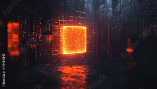 Glowing cube within a dark, structured space.