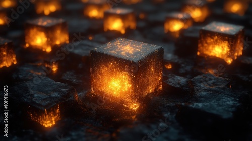 Glowing cubes emit bright orange light on a dark surface, representing futuristic energy sources or digital blocks.