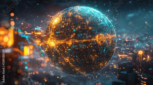 Glowing Digital Sphere Over Futuristic Cityscape at Night