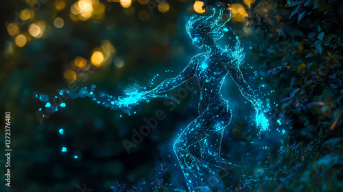 Glowing forest spirit, bioluminescent energy flowing through their body, magical realism. Bioluminescent Forest Spirits. Illustration