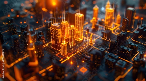 Glowing Futuristic Cityscape with Illuminated Skyscrapers at Night