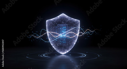 Glowing futuristic security shield with digital data inside. Cybersecurity and data protection concept. Abstract internet defense symbol.