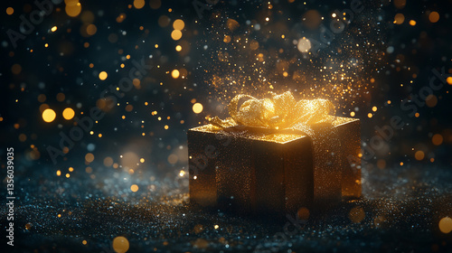 gift box, gold, sparkling, light, magical, festive, ribbon, wrapped, glowing, holiday, celebration, enchanting, atmosphere, present, bright, shimmer, decorative, surprise, ornate, glistering, mystical, special occasion, shiny, radiant, luxurious, dreamlike, glamourous, night, illuminated