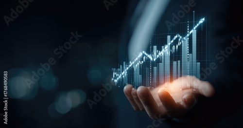 graph, chart, datum, growth, trend, up, upward, positive, increase, profit, success, finance, investment, stock, market, business, economy, progress, development, performance, analysis, insight, future, strategy, digital, technology, virtual, futuristic, glowing, light, bright, illumination, hand, palm, holding, support, control, presentation, display, visual, conceptual, abstract, modern, professional, serious, dark, background, bokeh, blurred