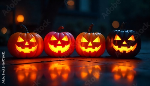 Glowing halloween jack-o'-lanterns casting eerie shadows in dark room, carved pumpkins for spooky celebration, created with generative ai