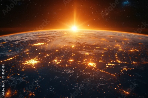 Glowing horizon at sunrise over Earth with cities illuminated in detailed view from space, showcasing natural beauty and human activity