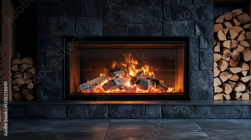 Glowing hot coals surrounded by firewood in fireplace create warm and inviting atmosphere, perfect for cozy winter evenings indoors