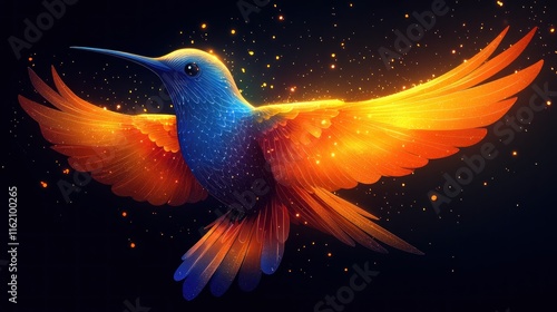 hummingbird, bird, wing, flight, glow, fire, orange, blue, dark, night, sparkle, shiny, magic, fantasy, mystical, vibrant, colourful, beauty, nature, wildlife, animal, avian, feather, exotic, tropical, energy, power, light, bright, art, illustration, graphic, digital, design, abstract, painting, artwork, image, picture, photo, background, texture, pattern