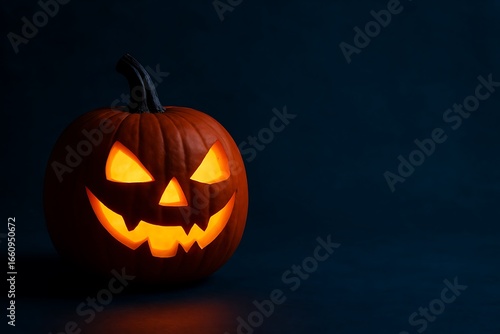 Glowing jack-o'-lantern with a spooky face stands against a dark blue background in dim lighting.