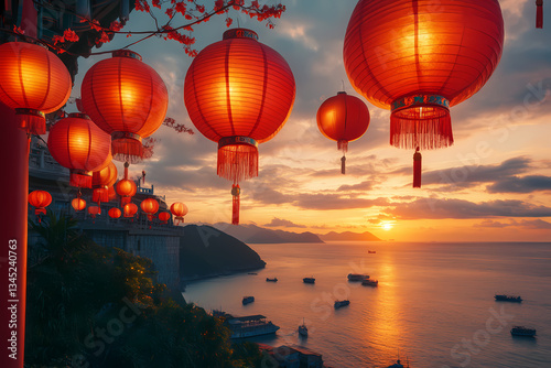 Glowing Lanterns Over the Sea: Red lanterns casting a warm glow, are suspended over the sea during the sunset creating a beautiful scenery.
