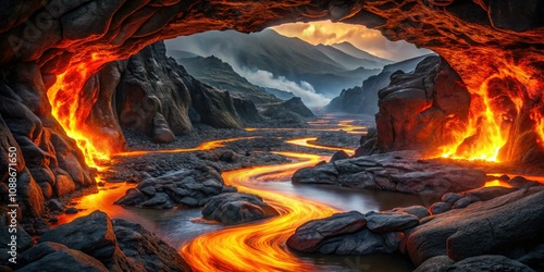 Glowing Lava River in Dark Cave: Captivating Documentary Photography of Nature's Fiery Wonders and Geological Marvels in a Mysterious Underground World