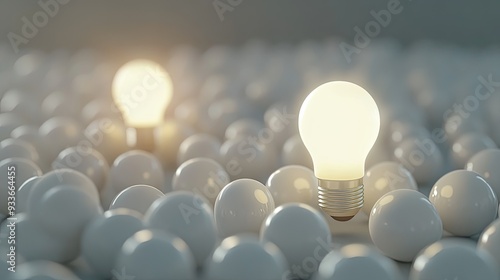 Glowing light bulb highlighted among many white background bulbs in a 3D rendering, with space for adding inspirational or creative messages