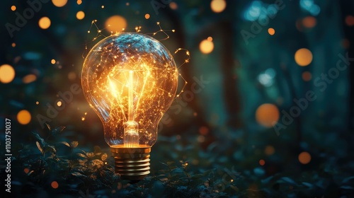 Glowing Light Bulb Surrounded by Sparkling Lights Symbolizing Creativity and Innovation in a Mystical Forest Setting