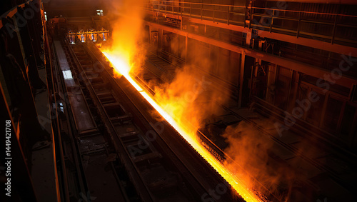 Glowing molten metal flowing down tracks in a steel factory, highlighting the raw energy, intense heat, and industrial power of the process.