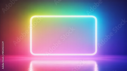Glowing multicolored neon rectangle frame reflected on a glossy surface with vibrant background