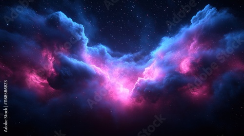 Glowing nebula cloudscape with pink and blue hues in dark space.