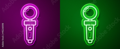 Glowing neon line Joystick for arcade machine icon isolated on purple and green background. Joystick gamepad. Vector Illustration.