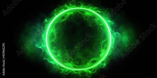Glowing neon ring emitting green smoke on dark background, neon, ring, glowing, green, smoke, dark, background, vibrant