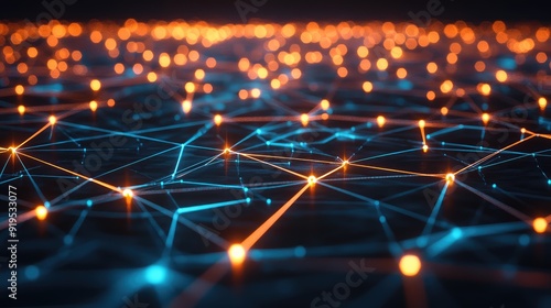 Glowing nodes connected by bright light lines, forming a dynamic network of data flow.