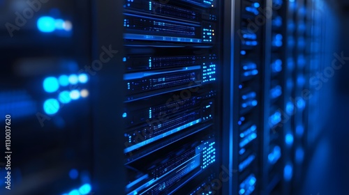 Glowing servers, a digital fortress safeguarding vast data streams. Cybersecurity's silent guardian.