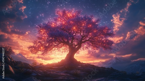 sunset, tree, magical, fantasy, star, night, sky, cloud, mountain, landscape, glowing, light, pink, purple, orange, digital, art, artwork, nature, scenic, serene, peaceful, dreamlike, aethereal, mystical, tranquil, majestic, breathtaking, beauty, wonder