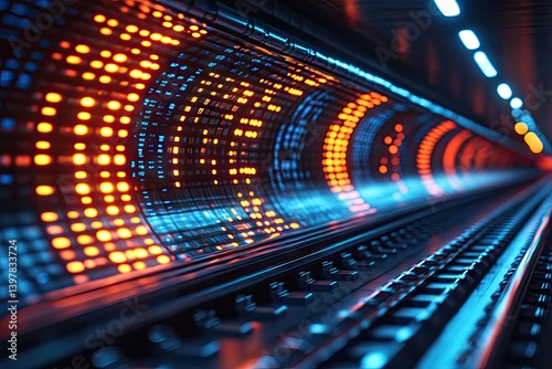 tunnel, rail, train, transportation, light, glowing, technology, futuristic, abstract, travel, railway, track, underground, subway, urban, infrastructure, transport, architecture, perspective, pattern, line, speed, motion, depth, digital, network, connection, innovation, city, dark, blue, orange, modern, structure, electricity, power, engineering, metallic, surface, rail, distance, journey, inside, interior, design, illuminated, long, forward