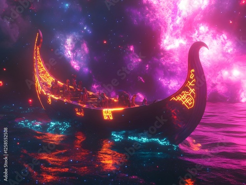 ship, fantasy, space, viking, boat, cosmic, wave, neon, rune, futuristic, mythology, glowing, dark, night, adventure, journey, celestial, spiritual, mysterious, epic, dramatic, atmospheric, surreal, digital, art, vessel, mystical, celestial bodies, ancient culture, dimensional, fantastical, conceptual, visionary, imaginative, abstract, high-coloured, aethereal, enchanting, captivating, mesmerizing