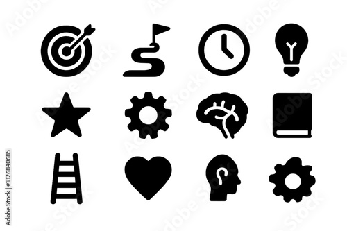 goal, setting, icon, solid, icon, set, target, arrow, path, flag, clock, light, bulb, star, gear, brain, book, ladder, nubes, filled, light bulb