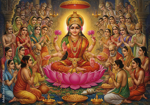 goddess, culture, indian, deity, spiritual, religion, ritual, divine, worship, hinduism, vibrant, wealth, prosperity, art, celebration, belief, blessing, sacred, faith, spirituality, mythology, beauty, temple, traditional, ornate, devotee, illustration, gold, indian culture, lotus flower
