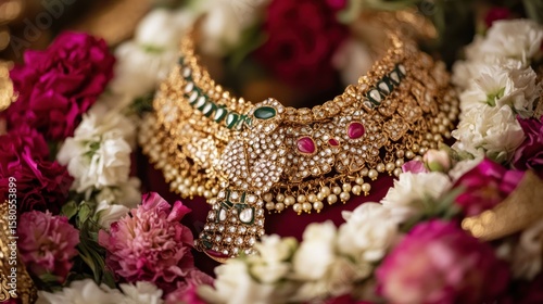 necklace, choker, gold, gem, jewellery, bead, pearl, ruby, emerald, flower, pink, red, white, indian, bridal, luxury, precious, elegant, detail, closeup, vintage, traditional, design, ornament, bright, glamour, accessory, fashion, celebration, wedding, beautiful, sparkling, luxurious, ornamental, arrangement, floral, bouquet, display, composition, blood-red, greenish, culture