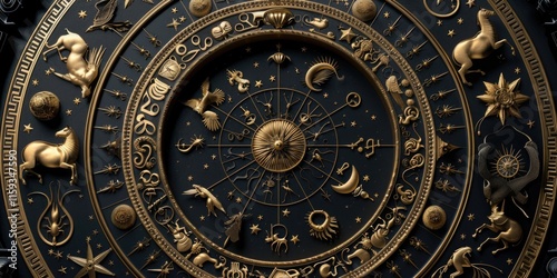 Gold astrological chart with symbols representing planets, stars and constellations.