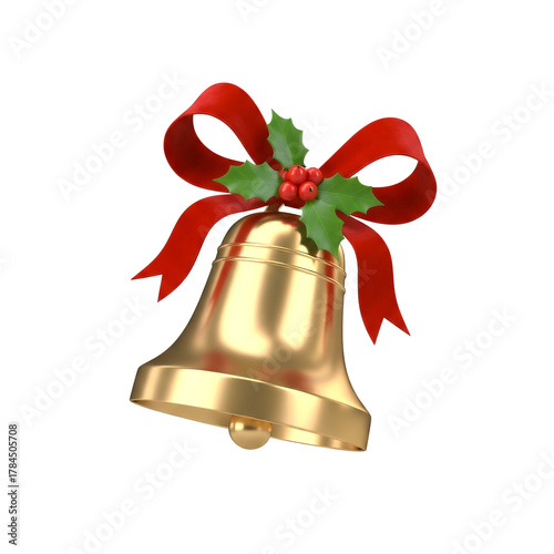Gold bell with red ribbon and holly leaves shiny Christmas ornament decorated with festive ribbon and green holly 3D render isolated for winter celebration visuals