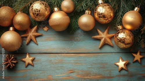 Gold Christmas ornaments & pine on rustic wood.