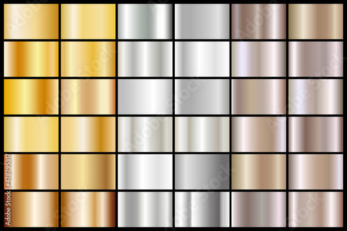 Gold foil, silver, and bronze texture background. Gold, copper, brass, and metal gradient vector template. Vector graphics of shining rainbow patterns. Collection of holograms with metallic gradients