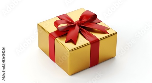 Gold gift box tied with a vibrant red ribbon, a festive present on white