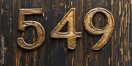 Gold numerals 549 displaying a textured finish on a dark brown to off-white wooden background with rich grain patterns and deep shadows.