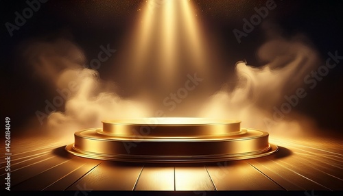 gold podium on dark background with smoke empty pedestal for award ceremony platform illuminated by spotlights made with generative ai