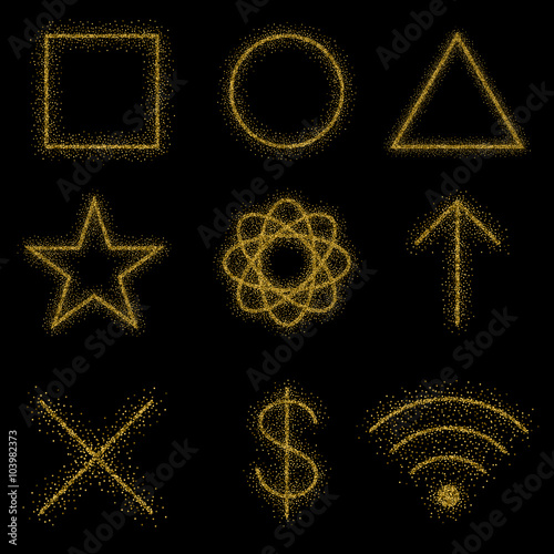 Gold symbols on black background: circle, square, triangle, cross, dollar, web, ellipse, arrow. Icons are made in the style of golden stipple.