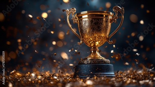 trophy, gold, confetti, award, celebration, success, victory, achievement, winner, sparkle, shining, dark, background, blur, sharpened, detail, vintage, elegant, luxury, premium, exquisite, classic, ornament, design, contest, competition, honour, prestige, recognition, pride, excellence, motivation, inspiration, metallic, celebratory, sparkling, triumph, celebrate, emblem
