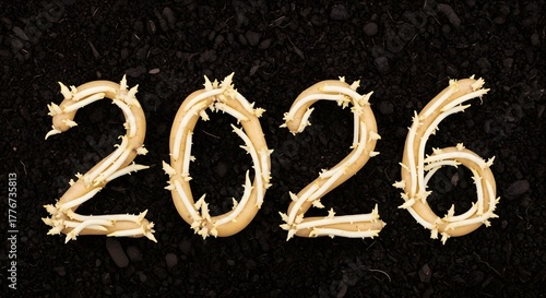 2026, new year, year, number, gold, gold, metallic, shiny, bright, glowing, illumination, light, twig, branch, natural, organic, plant, nature, texture, dark background, black background, contrast, celebration, future, countdown, event, holiday, season, winter, hope, opportunity, creative, design, graphic, art, abstract, symbol, concept, typography, font, number, date