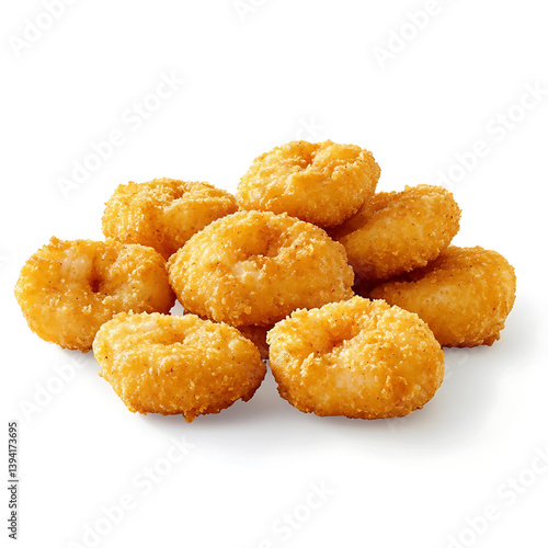 Golden and crispy breaded shrimp with a crunchy exterior and tender shrimp filling, isolated white background, hyperrealism art style