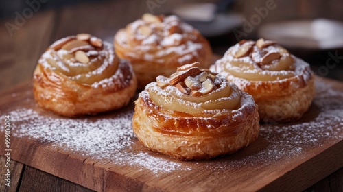 Golden apple almond pastries with a crispy glaze, arranged on a rustic wooden board generative ai