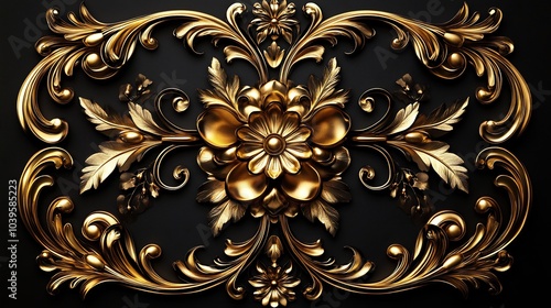 Golden Baroque ornament swirling floral motifs detailed leaf patterns elegant filigree 3D layout framed rococoinspired scrolls set against a minimalistic black background for a rich decorative effect