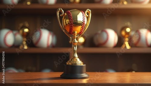 Golden baseball trophy sits on a wood table surrounded by baseballs and other awards on shelves. Represents sports victory achievement and team success.