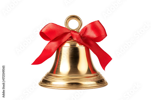 Golden bell adorned with a red ribbon, symbol of festivity isolated on white background
