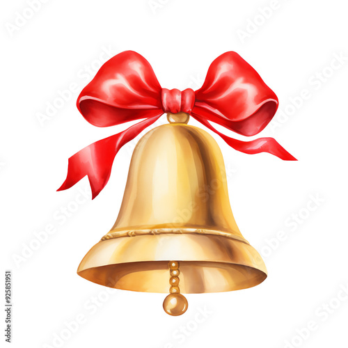 Golden bell with a red bow, perfect for holiday decoration, celebrations, and festive designs. Symbol of joy and celebration.