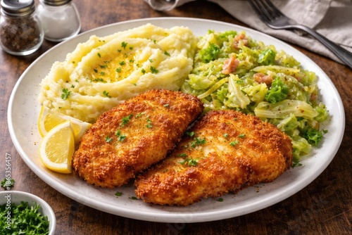 Golden breaded meat served alongside buttery mashed potatoes and steamed cabbage