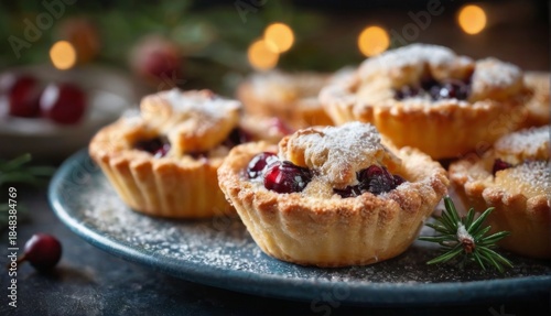 festive, cosy, cranberry, tart, plate, baked, gold, brown, crumbly, texture, powdered, sugar, shiny, blue, scattered, background, small, bowl, sprig, rosemary, image, freshly, dusted, appearance, few, mood