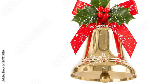 Golden christmas bell with holly and red ribbon